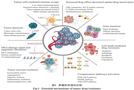 耐藥幾乎存在于所有類型的腫瘤和所有抗癌藥物中, 是腫瘤治療面臨的重大挑戰(zhàn)。腫瘤耐藥是宿主、腫瘤細(xì)胞、免疫系統(tǒng)與腫瘤微環(huán)境共同作用的結(jié)果。耐藥的機(jī)制復(fù)雜且處于動態(tài)變化中, 微環(huán)境的改變、腫瘤細(xì)胞在治療壓力下發(fā)生基因突變等諸多復(fù)雜的因素都可能誘發(fā)耐藥, 不同的影響因素可以同時發(fā)生在單個腫瘤中。主要發(fā)生機(jī)制包括腫瘤內(nèi)藥物蓄積減少、藥物滅活、基因突變、代償通路激活、細(xì)胞死亡方式、DNA損傷修復(fù)和表觀遺傳學(xué)改變、腫瘤可塑性以及腫瘤微環(huán)境等8個方面。其中對基因突變、代償通路激活兩個方面的研究探討,是目前靶向