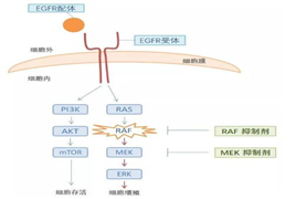RAF 家族蛋白有 3 種類型:A-RAF、B-RAF 和 C-RAF。其中B-RAF蛋白被BRAF基因編碼。這種蛋白在RAS/RAF/MEK/ERK信號通路(MAPK信號通路的一個重要組成部分,主要負責調節(jié)細胞的增殖、分化、遷移和凋亡等生物學過程)中起核心作用,BRAF基因的異常突變可導致該通路的持續(xù)激活,從而導致細胞的不受控增殖和存活,抑制細胞凋亡,并增強腫瘤的侵襲性和轉移能力。