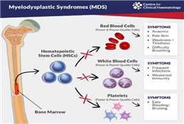 骨髓增生異常綜合征(Myelodysplastic Syndromes, MDS)是一組起源于造血干細胞的異質(zhì)性髓系克隆性疾病,其特點是骨髓中血細胞發(fā)育異常,導致外周血細胞數(shù)量減少,并且有較高的風險轉(zhuǎn)化為急性髓系白血病(Acute Myeloid Leukemia, AML)。MDS可以視為白血病的前期病變,大約30%的MDS患者最終會進展為AML。