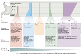 胃癌的組織病理學(xué)分型主要有Lauren分型和世界衛(wèi)生組織(WHO)分型。但僅僅基于形態(tài)學(xué)的分型方法不足以展示胃癌的分子和基因的異質(zhì)性,無(wú)法為胃癌的臨床治療、評(píng)估療效和預(yù)測(cè)預(yù)后提供更精準(zhǔn)的信息。依據(jù)分子和基因特點(diǎn)鑒定胃癌的亞型對(duì)制定臨床治療方案十分必要。隨著基因組技術(shù)的發(fā)展,癌癥基因組圖譜(The Caner Genome Atlas, TCGA)和亞洲癌癥研究小組(Asian Cancer Research Group, ACRG)通過(guò)分析多個(gè)平臺(tái)的數(shù)據(jù)發(fā)布了兩個(gè)里程碑式的分子分型方法,為我們帶